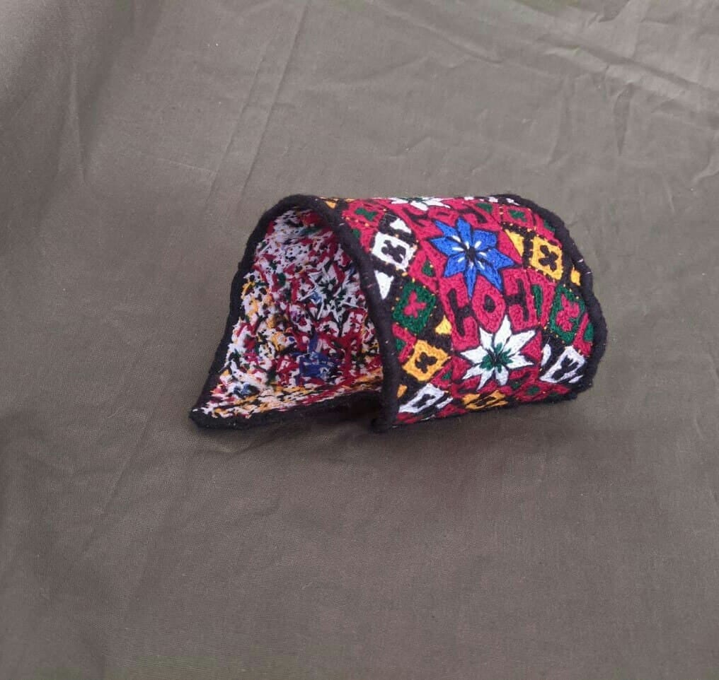 Inspiriert vom reichen Erbe der traditionellen Stickkunst Nordost-Irans, wurde diese Manschette in 32 Stunden sorgfältiger Handarbeit gefertigt. Das Muster stammt aus dem historischen Dorf Žaraf – gelegen inmitten der Hazar-Masjed-Berge, 140 km von Maschhad entfernt – wo Frauen seit Generationen kunstvolle Nadelarbeiten als Teil ihrer traditionellen Kleidung anfertigen.